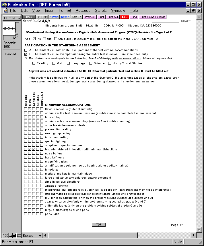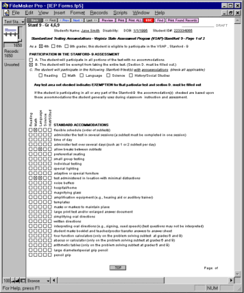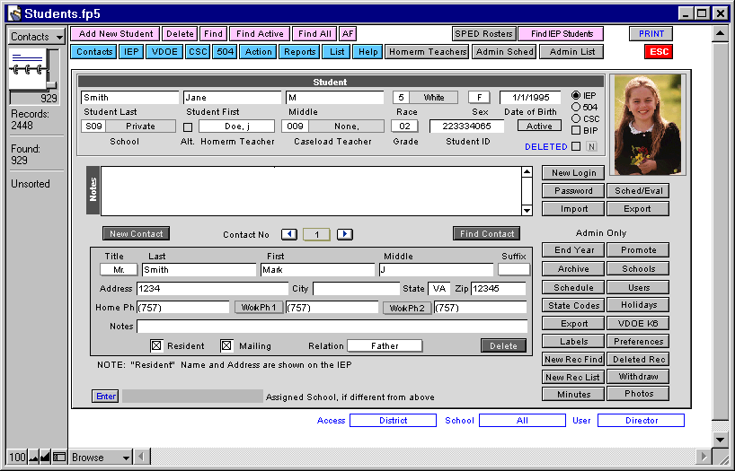 FileMaker allows for a very intuitive and flexible user interface, with all forms shown "as is", to be filled in on screen with minimal training. Each student record shows all contact info, forms, and complete schedule (see partial list at left). The solution is cross platform, and network based, to allow for central District control (FileMaker Server currently supports up to 250 simultaneous users). Individual student records can also be exported to an apple notebook for editing at home.
